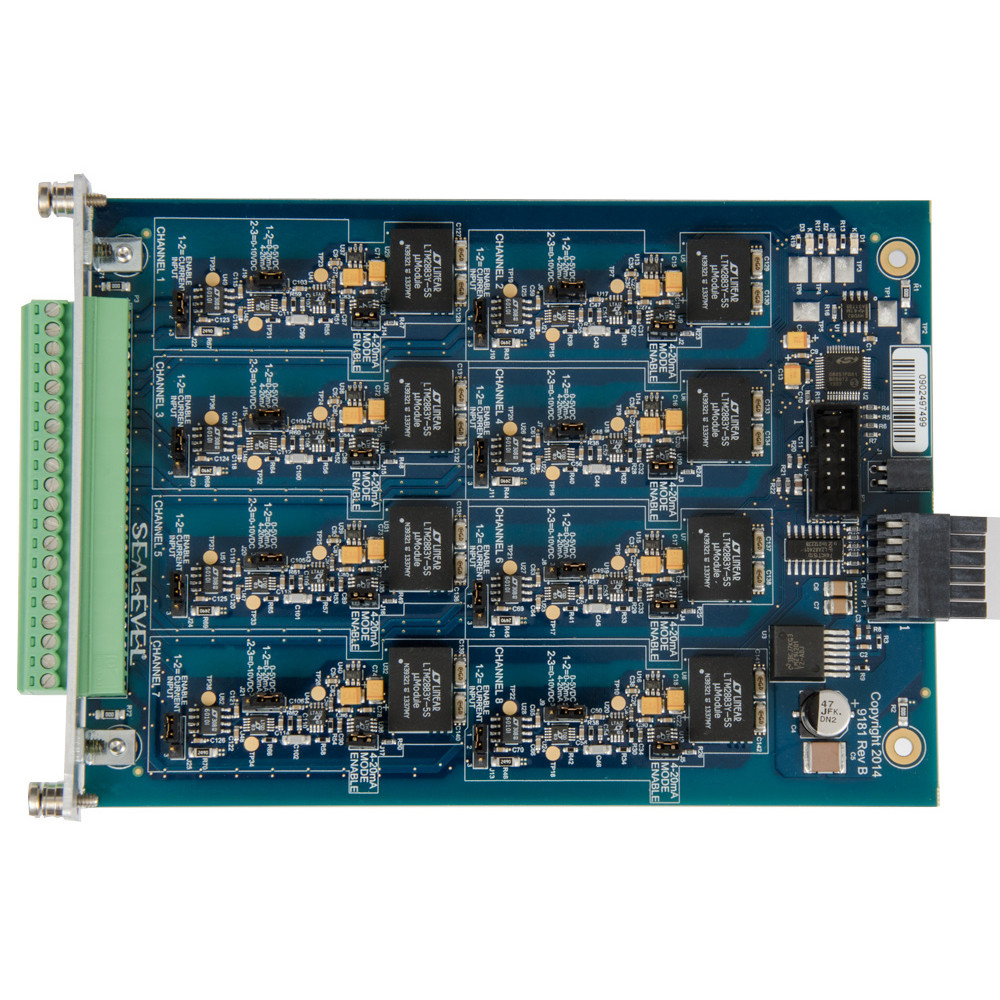 The current loop receiver inputs are ideal for interfacing a wide variety of industrial process control and test equipment that use 4-20 mA signaling. The 4-20 mA standard remains a popular method for signal transmission in harsh environments, even over long distances. Current loop has a low sensitivity to electrical noise and is not affected by signal loss over cable runs or interconnections. For easy, reliable field wiring, the board uses removable, high-retention terminal block connectors.