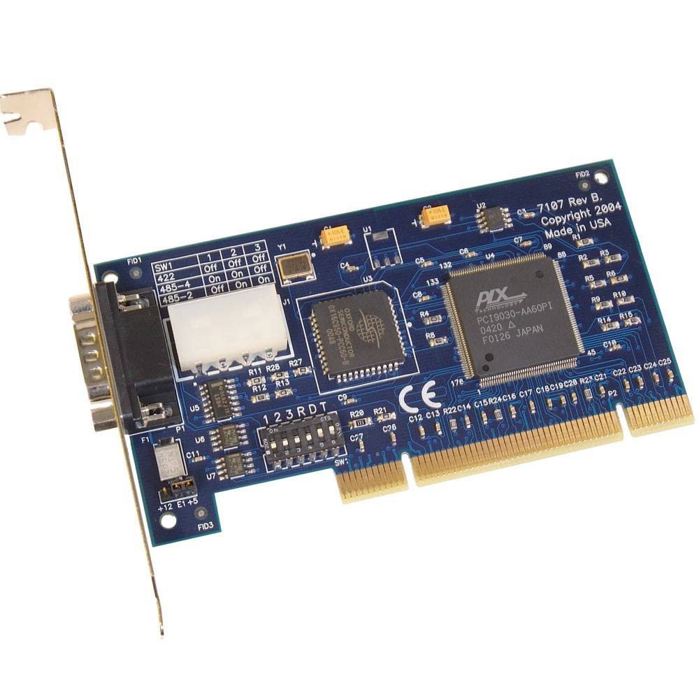 The 7107 Low Profile PCI serial interface provides one serial port configurable for RS-422 or RS-485 and is capable of data rates to 921.6K bps. The 7107 utilizes an Oxford 16C950 UART to provide 128-byte Tx/Rx FIFOs, for maximum reliability in data-intensive applications, and supports 9-bit protocols and isochronous mode.