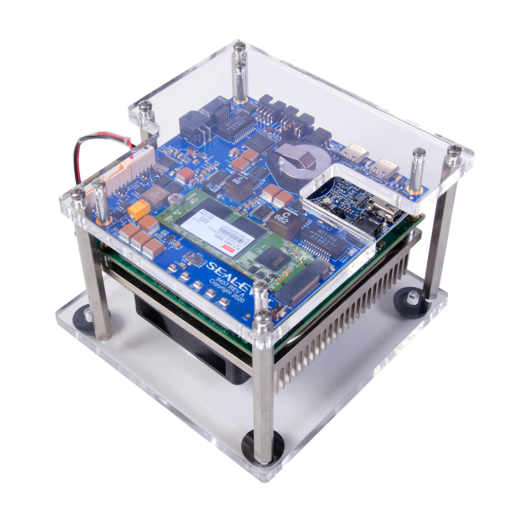 The complete evaluation kit (Part #12009-001-KT) includes a Type 6 module with Intel Core i3-8145UE CPU and 8 GB DDR4 RAM. Additionally, to improve the development process, the kit includes a 128GB M.2 SATA SSD module (supports Windows® and Linux® operating systems), a desktop power supply, and a wide variety of cables to facilitate connections to serial and Ethernet ports and optional fans. Power button and power-indicating LED also included.