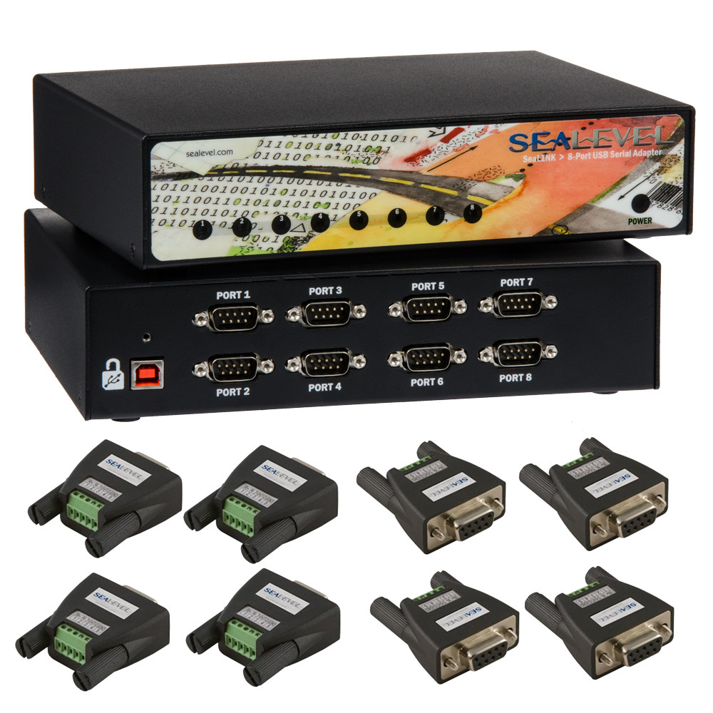 The SeaLINK® 2802 USB serial I/O adapter provides eight RS-422 or RS-485 serial ports for USB connectivity to legacy or non-USB compliant devices. Each serial port can be individually configured via dipswitches located inside the enclosure.